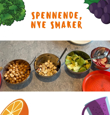 Å bli kjent med nye smaker og matvarer er også en viktig del av prosessen. Vi introduserer nye råvarer og har "smaksprøver" ukentlig. Å utvide sitt reportoar av nye råvarer og smaker er en sentral del av arbeidet med mat i barnehagen.