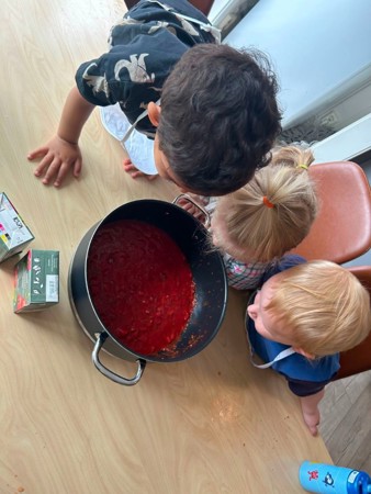 Vi lager mat med barna en gang i uken, vi mener barna lærer mye av å få være med på prosesser der de får utforske og oppleve hvor maten kommer fra og hvordan den havner på tallerkenen deres. Vi har nye smaksprøver hver uke og gir barna muligheter til å utvide horisonten i forhold til mat. De opplever en følelse av stolthet og mestring når de spiser maten de har vært med på å lage.